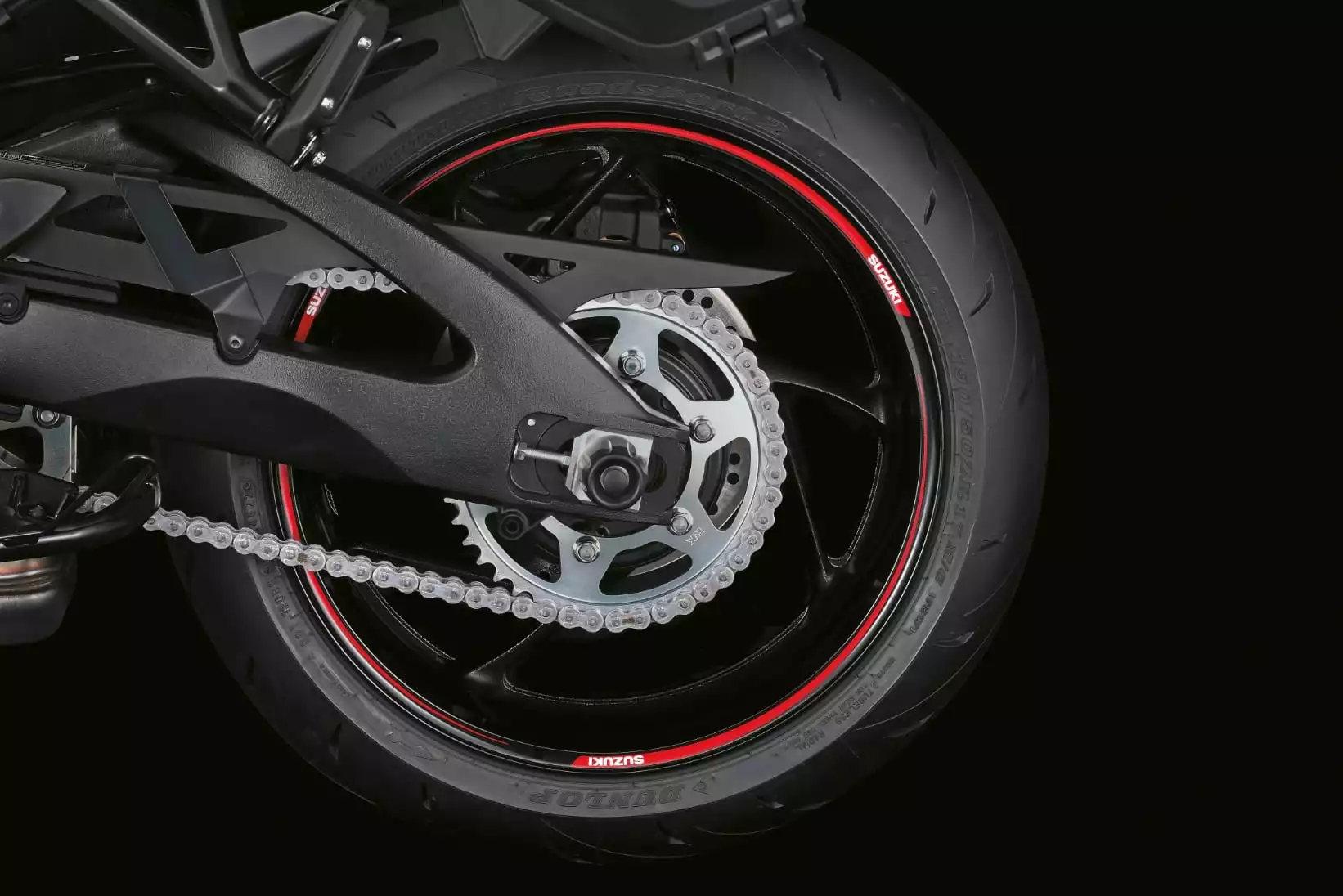 Rot-schwarzes Dekor mit Suzuki-Logo.