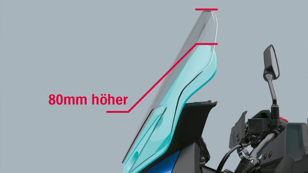 Hohe Tourenscheibe, für einen bessern Windschutz, um den Komfort auf langen Fahrten zu erhöhen (80 mm höher als die Standardscheibe).
